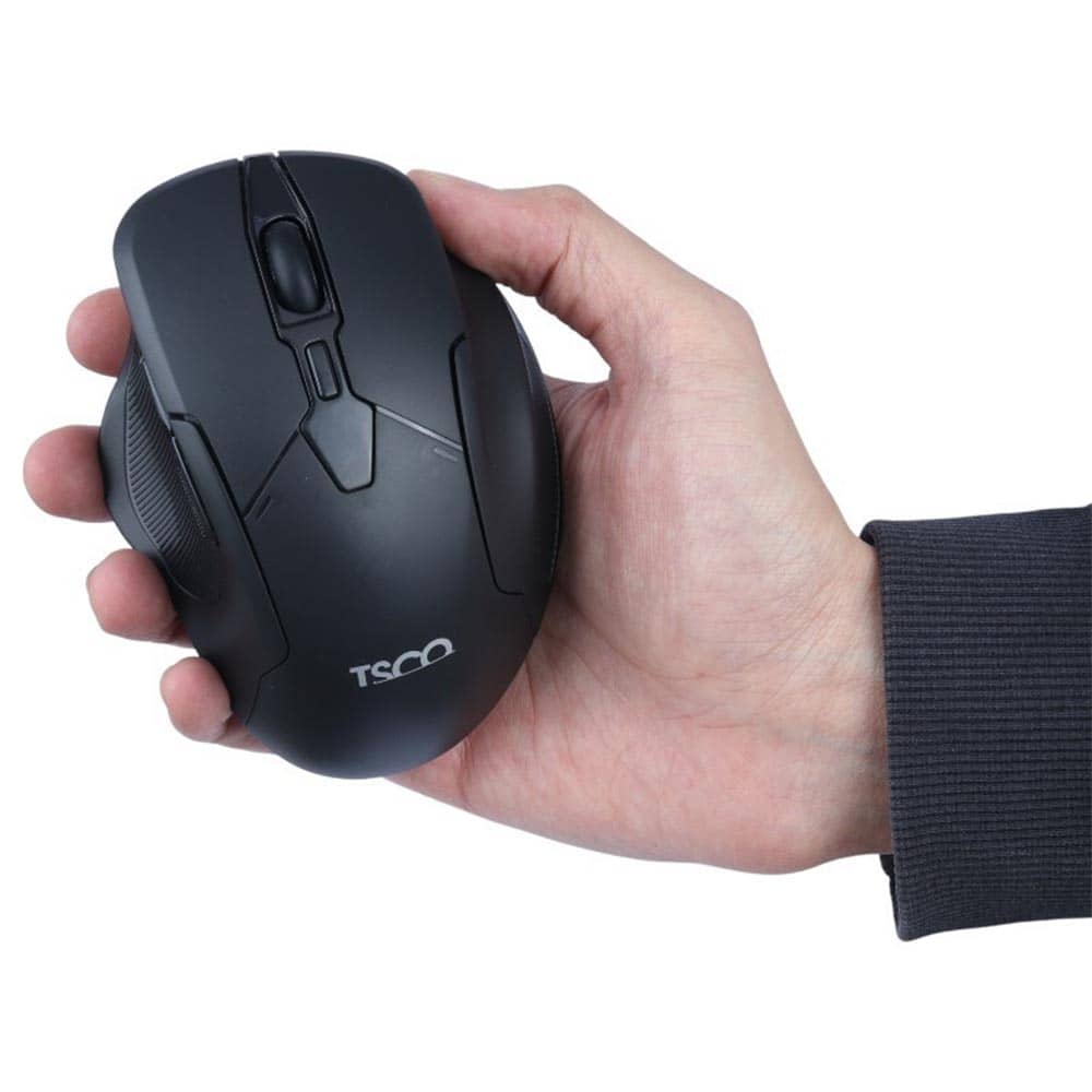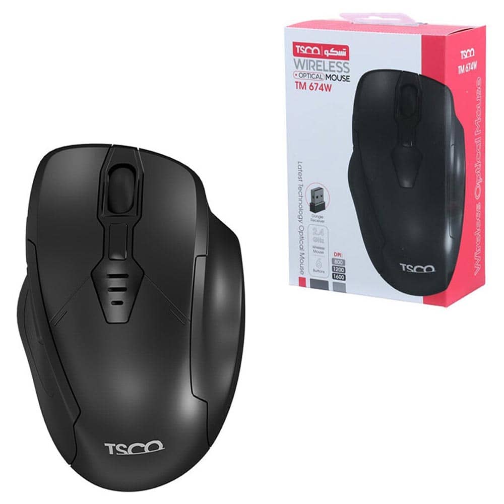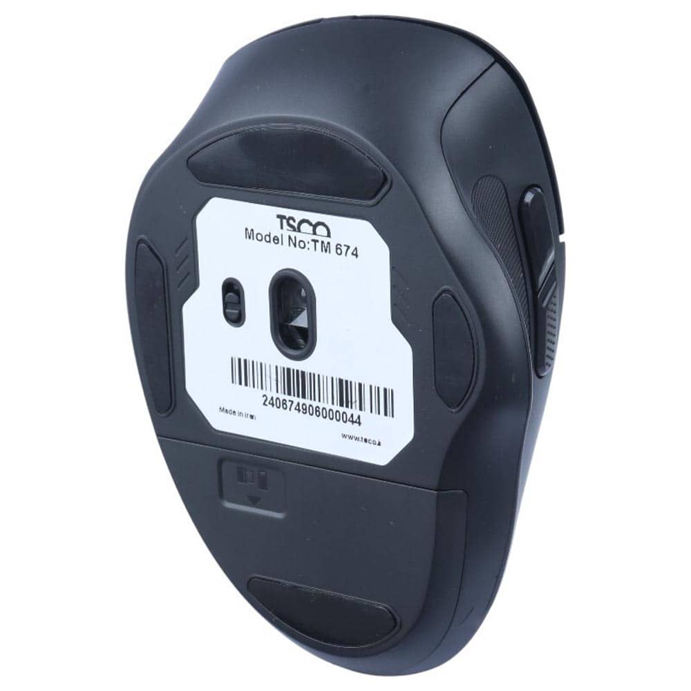 ماوس تسکو مدل TM 674W با ابعاد 112×82×47 میلیمتر طراحی شده تا بهخوبی در دست قرار بگیرد. پهنتر بودن بخش میانی و انحنای ملایم پشت ماوس باعث شده کف دست بدون فشار روی آن بنشیند و انگشتها در جای طبیعی خود قرار بگیرند. این فرم ارگونومیک باعث میشود استفاده طولانیمدت از ماوس بدون خستگی یا فشار روی مچ انجام شود، مخصوصاً برای کسانی که ساعتها با لپتاپ کار میکنند.