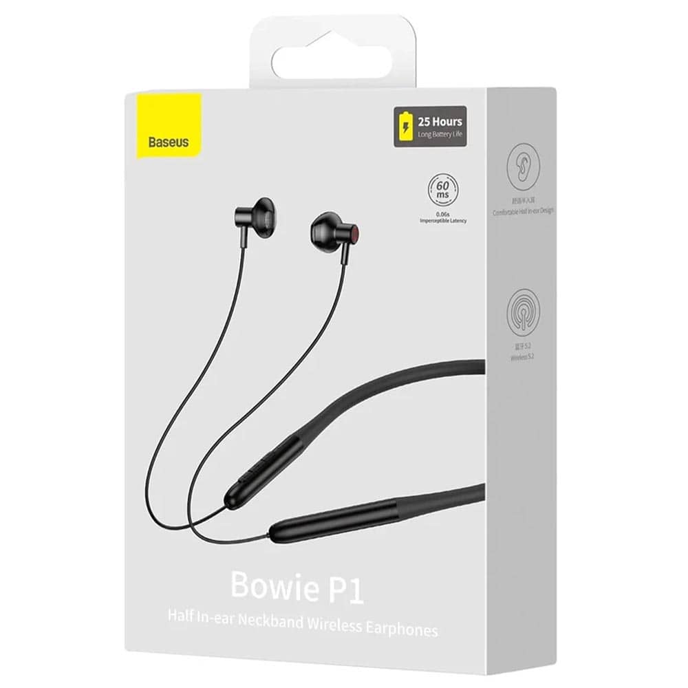 Baseus Bowie P1 Neckband هدفونی گردنی و نیمدرگوش است که برای استفاده روزمره، ورزش سبک و تماشای ویدئو طراحی شده. تبلیغات رسمی و صفحات فروش آن، باتری طولانی، درایور 14mm و بلوتوث نسخه 5.2 را برجسته میکنند.