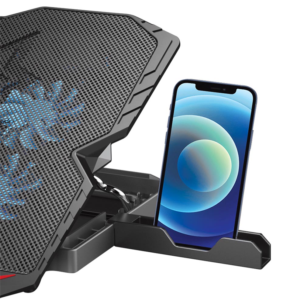 در ساختار این مدل، ۶ عدد LED تعبیه شده که هنگام روشن شدن فن‌ها، نور آبی ملایمی از زیر پایه پخش می‌شود. این نور نه‌تنها ظاهر دستگاه را جذاب‌تر می‌کند، بلکه نشانگر فعال بودن سیستم خنک‌کننده نیز هست؛ بدون اینکه در محیط‌های کم‌نور باعث حواس‌پرتی شود.